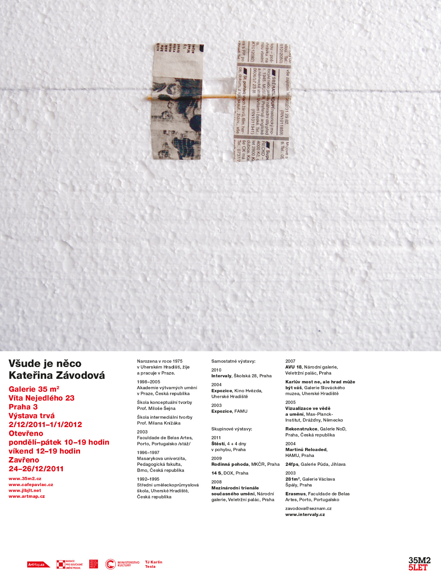 Výstava "Všude je něco" je na první pohled překvapivá v tom, že tu nenajdeme žádné žádné reálné postavy. Dokonce by se dalo říci, že se Kateřina Závodová rozhodla formou instalace vyprávět příběh zcela nový - příběh o něčí nepřítomnosti. Důležitou a viditelnou změnou v její tvorbě je fakt, že se zde významově propojuje materiál, který je nalezený a není nijak manipulovaný.
